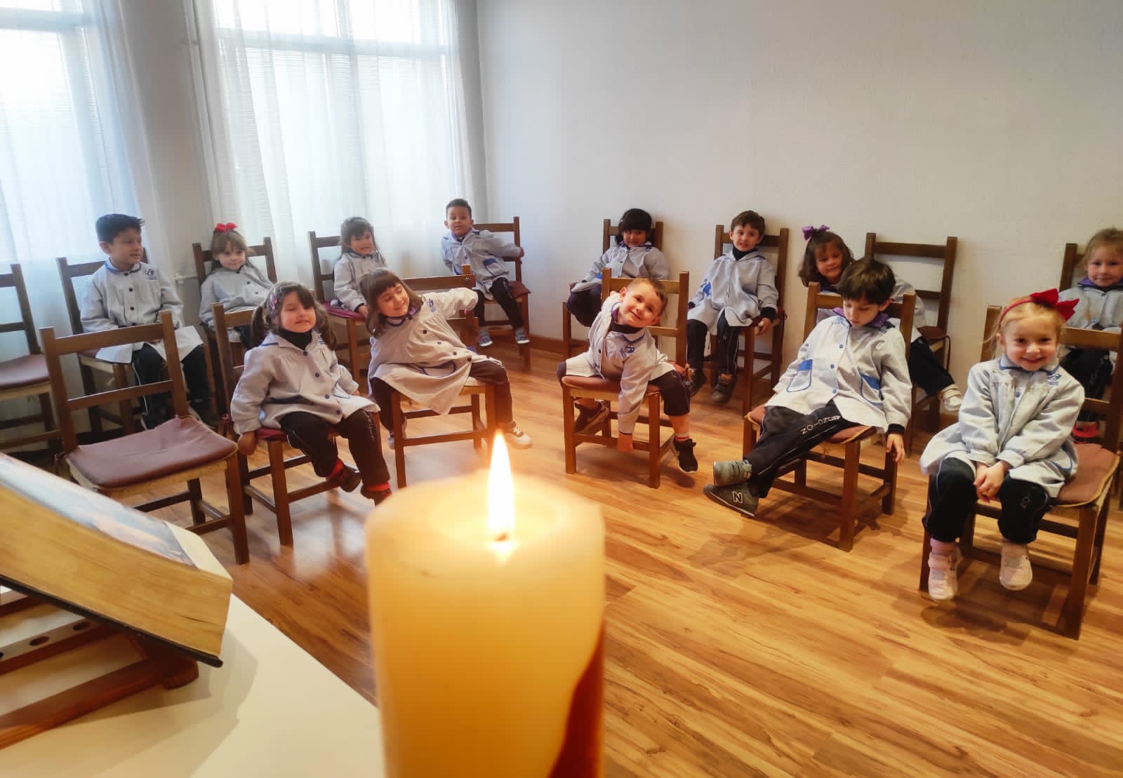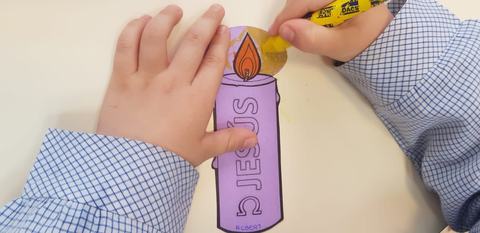 Durante la homilía tuvimos un momento de reflexión-interioridad, en el que cada uno tenía una vela impresa en una cartulina morada. En ella, escribimos qué luz éramos nosotros para los demás y qué luz recibíamos de las personas que teníamos alrededor. Estas velas las ofrecimos a Dios y después las pusimos por todo el colegio para recordarnos, que somos testigos de la Resurrección de Jesús y que esa luz tiene que ser visible en el mundo para poder transformarlo y hacer realidad el Reino de Dios.