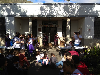 Seguidamente, en guagua, iniciamos el camino hacia “nuestro Padre el Teide” como lo llaman los canarios. Contemplamos desde la altura la naturaleza y el mar de nubes. El centro de Visitantes. Allí el diablo “GUAYO FA” nos explicó el origen y formación volcánica de las islas. El día fue lo más propicio para ello. Dejamos el Teide y nos dirigimos hacia Vilaflor, pueblo más alto de España. Por medio de una amiga, Begoña Rivero, el Ayuntamiento nos invitó a comer a todos. Antes de entrar en Vilaflor hicimos unas parada para abrazar un pino “el pino gordo, de más de 700 años” Se necesitaron 16 niños para rodearlo. Al final de la comida una religiosa Betlemita, Congregación fundada por el Santo Hermano Pedro, nos contó la historia del primer santo Canario: Santo Hermano Pedro de Betancourt. Pastor de cabras. Nació y vivió en Vilaflor. De donde partió para América a evangelizar. Bajamos a la Cueva donde guardaba sus cabras del ataque de los piratas. Lugar de gran devoción popular. Antes de ser declarado santo, ya lo era para la gente sencilla. Continuamos viaje hacia La Alegría donde tuvimos un festival preparado con mucho cariño por los padres y los niños. Donde nos expusieron la historia de los 50 años de la Asunción en La Alegría.
