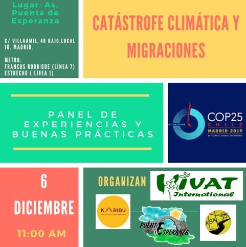 Tuvimos la posibilidad de reflexionar sobre ello, en el marco de la cumbre del clima, celebrada en Madrid del 2 al 13 de diciembre. En la sede de Puente de Esperanza y convocadas por VIVAT, celebramos un panel de experiencias y buenas prácticas, donde estaban representadas las Asociaciones ; Alba, Karibu y Puente de Esperanza, con la participación de tres inmigrantes que nos compartieron su experiencia de migración.