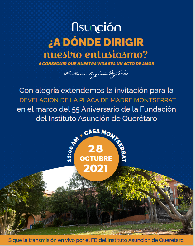 La Asunción de Querétaro nos invita a unirnos al descubrimiento de la placa en memoria de Montserrat Loring Miro. Madre Montserrat fue la primera superiora y tuvo una gran influencia en las familias. Montserrat murió en el accidente donde fallecieron 5 hermanas el 17 de julio de 1976.