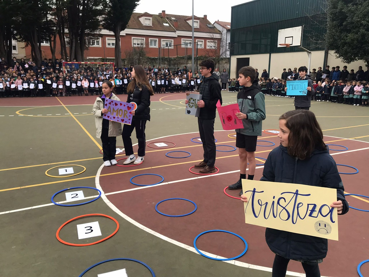En concreto los alumnos de infantil con sus profesores prepararon una coreografía en la que portaban unos banderines con manos de La Paz y cantaron con los alumnos de primaria la canción de Unai Quirós llamada UN PLANETA DE PAZ. En esta canción se cantan cosas como: “Sueño con un mundo de todos y ¡todas!, donde se disparen sonrisas, donde desechemos el odio y el podio y florezca paz y justicia. Qué más da el color, tu lenguaje, raza o religión. Únete a mi voz, la igualdad está en el corazón”.
