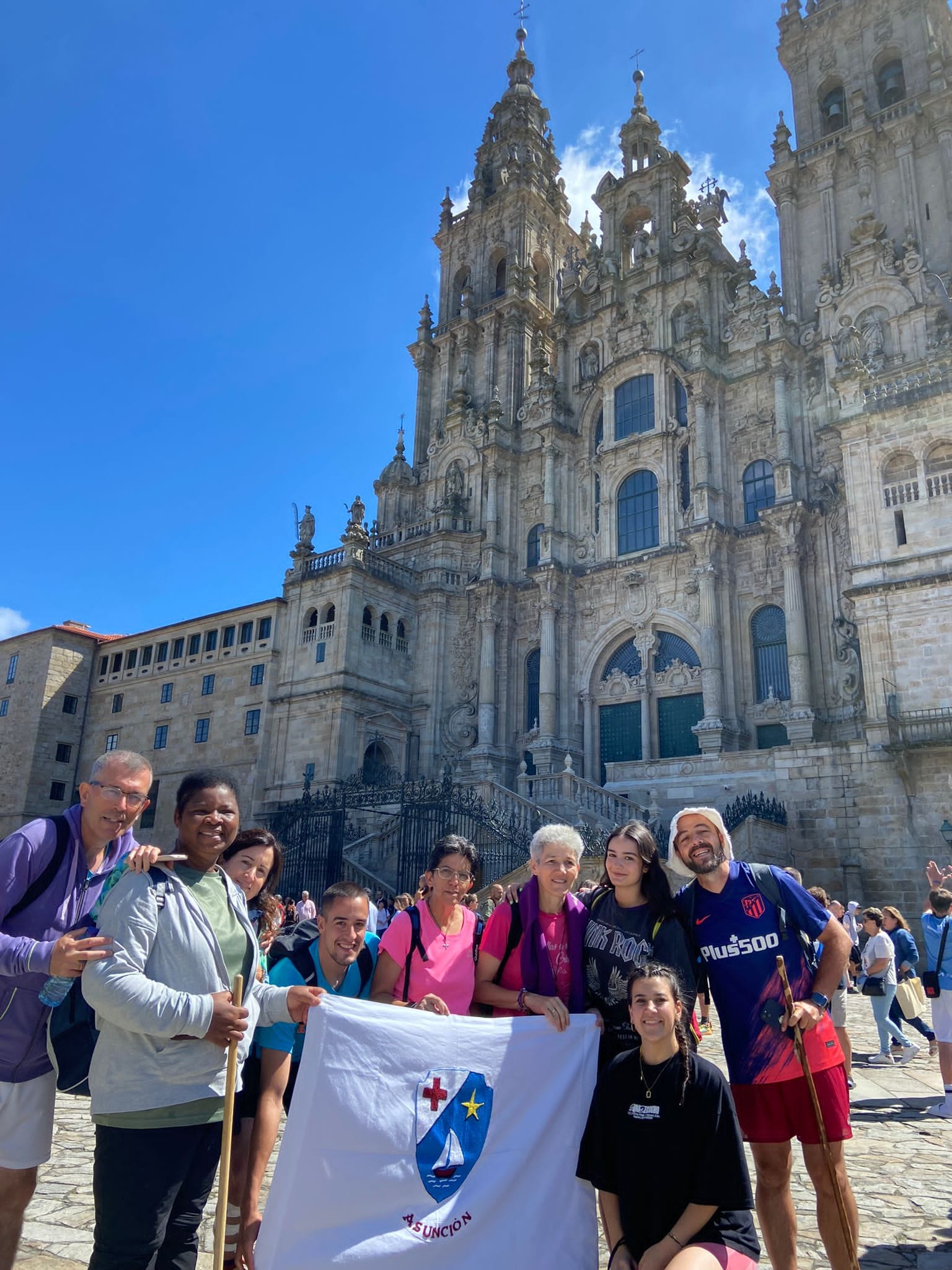 La llegada a Santiago, especialmente a la Catedral, fue otra grandiosa experiencia. Entramos triunfantes como Jesús en Jerusalén con las banderas de España y de la Asunción, con la canción “sube, sube Asunción con alegría y coraje. ¡Fue maravillosa!