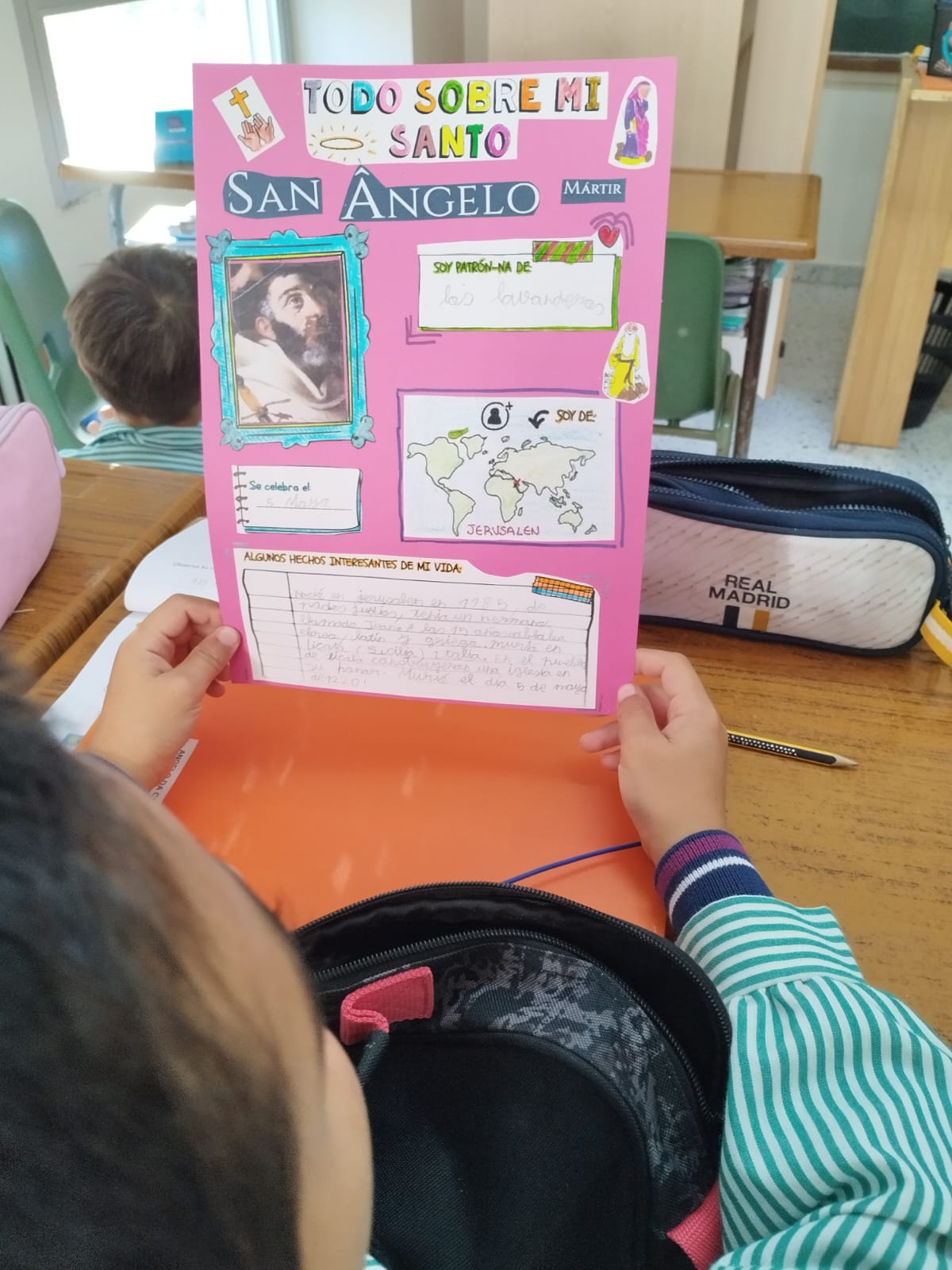 Para celebrar el día de todos los santos, en varios cursos el alumnado realiza presentaciones digitales y carteles de algunos santos que previamente han en el aula para mostrar a sus compañeros.